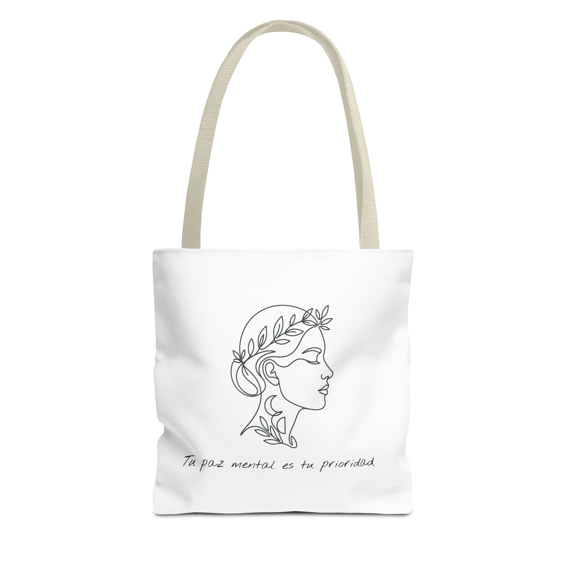 This lightweight tote brings quiet confidence to everyday carry. A single-line sketch of a laurel-crowned profile rests on clean white fabric, with a soft handwritten phrase beneath that reads like a private reminder. The slim black handles and minimal palette keep the look refined and wearable — balanced between artful and practical. It holds groceries, notebooks, or market finds without fuss, and the boxed corners give it a bit of structure so items sit neatly inside. Choose a handle color and size that fits your rhythm, then carry this understated piece as a small, steady statement in daily life.